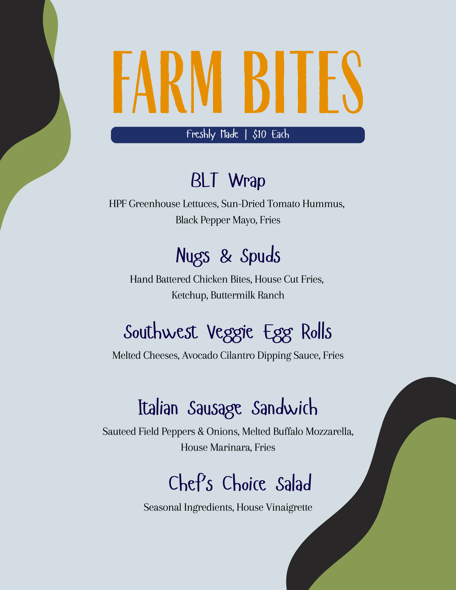 • Farm Bites will feature fresh boxed meals from our Farm Kitchen for you to enjoy. Menu and schedule is also listed on our website. You will order and pay for your Farm Bites once you arrive after check-in. All Farm Bite orders must be in by 7:00pm to ensure timely completion.